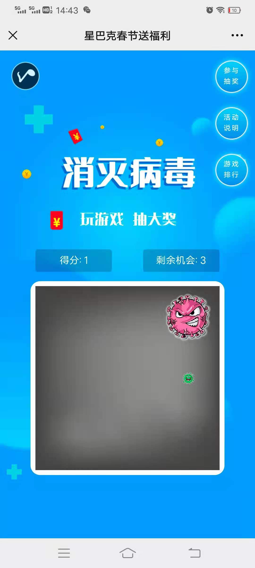 消灭病毒是一款好玩有趣的公众号互动营销小游戏,玩法简单,粉丝参与游戏,消灭病毒,消灭的病毒越多,活动的分值越高,达到指定的分值就可以参加抽奖活动,或者根据分值排行来发放奖品。