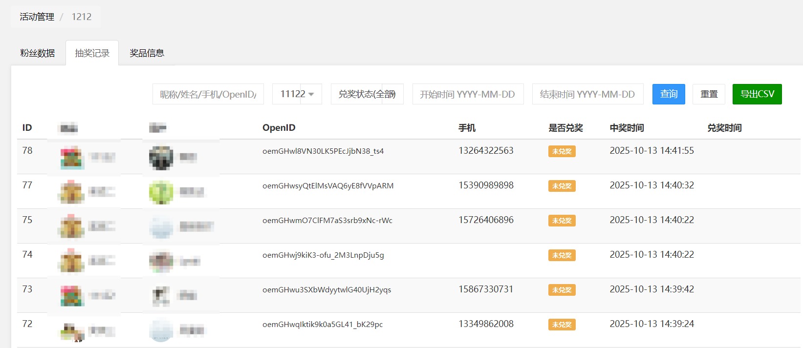 最后进入后台的数据管里可以查看中奖的数据,选择导出,可以把数据以表单的形式导出。