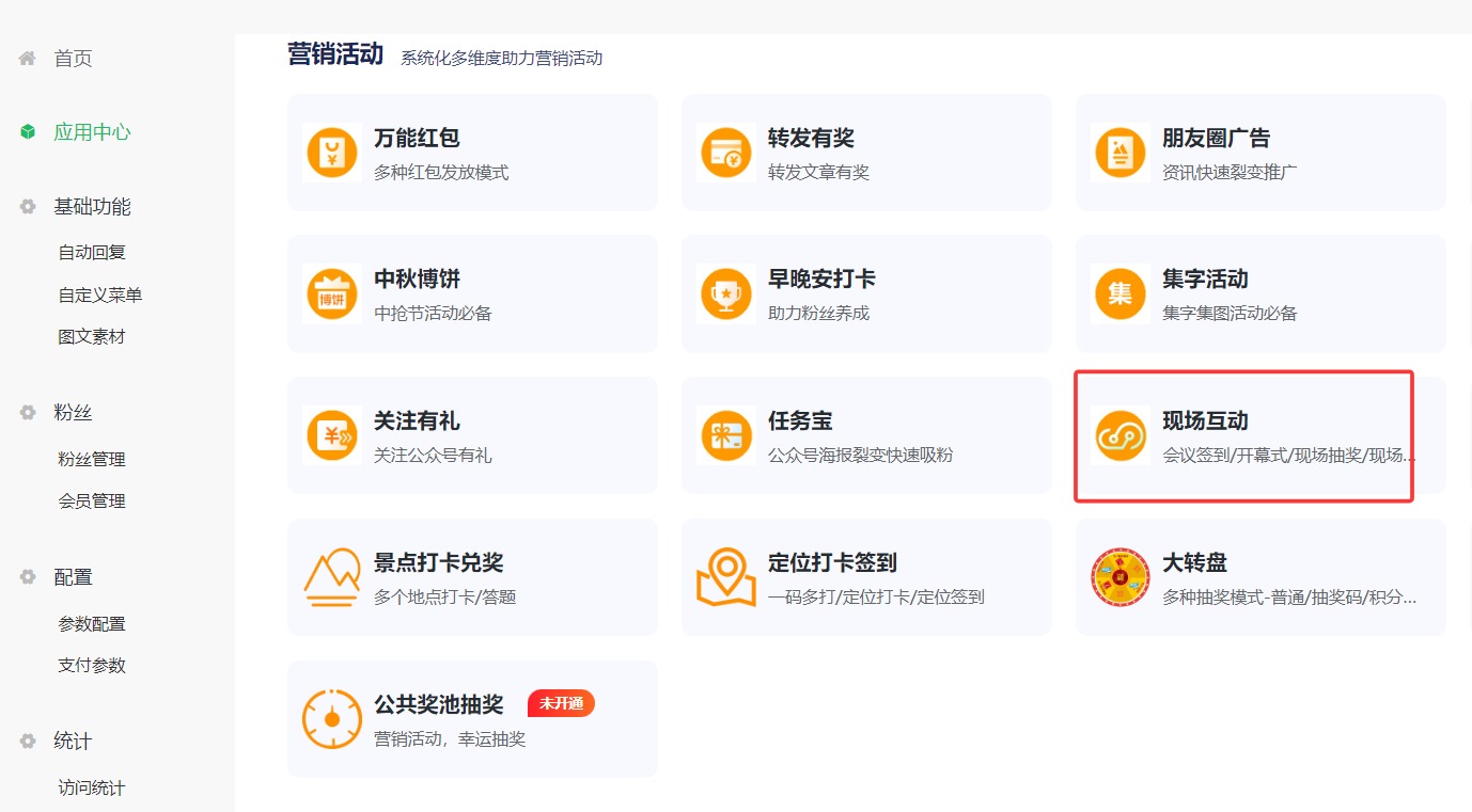 在微助平台注册后,登录系统后台,选择左侧应用中心的大屏互动模板,进入模板后台。
