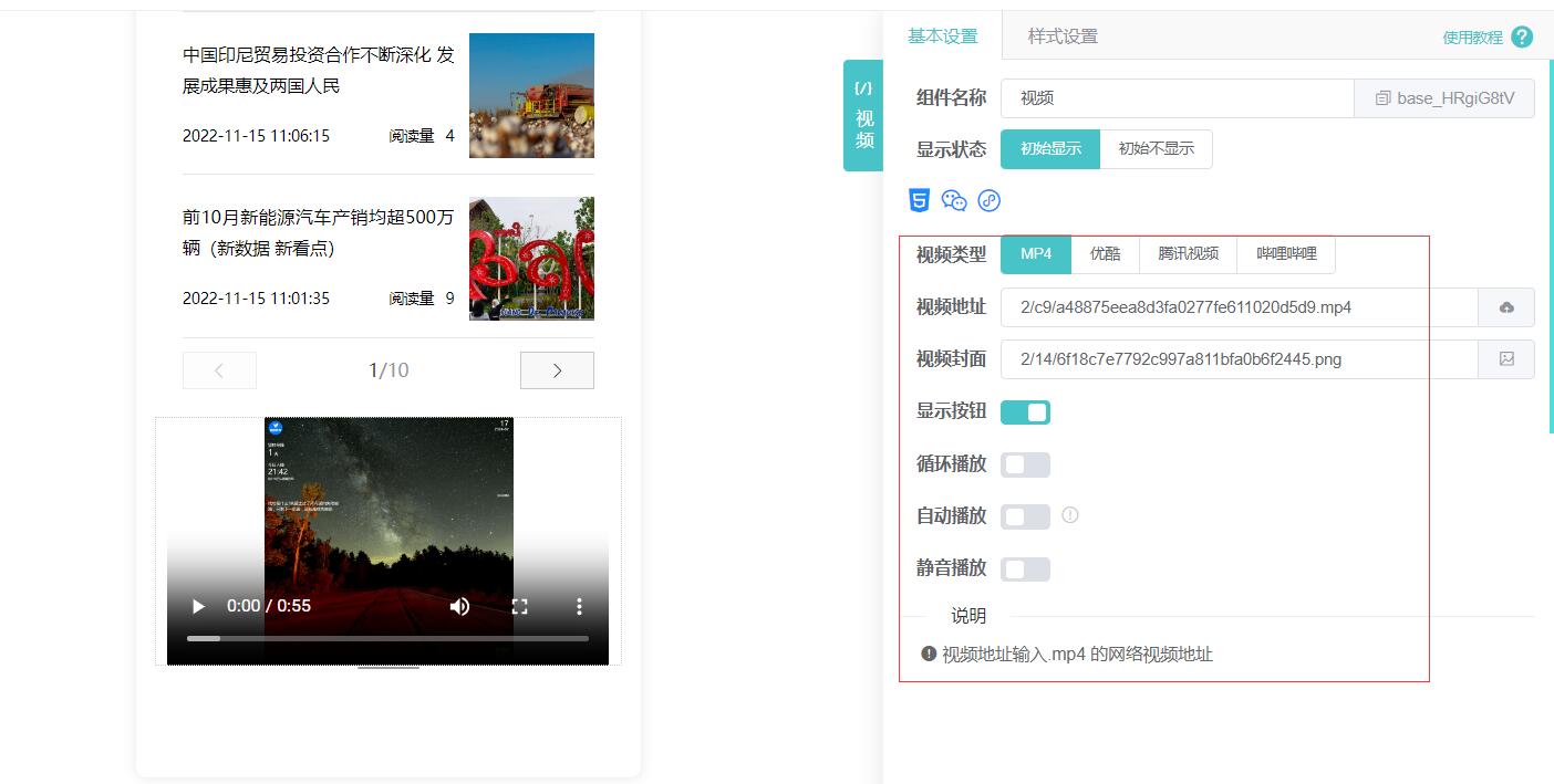 第二步:选择创建好的页面,选择【装修】,进入页面装修界面,在左侧的控件栏里选择【视频】组件,添加后,在右侧的 视频组件属性里,选择上传视频,添加视频的封面,保存完成页面添加