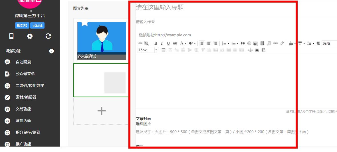 今天小编介绍一下如何利用微助微信第三方平台的文章系统群发多篇文章,进入微助后台,选择素材编辑器