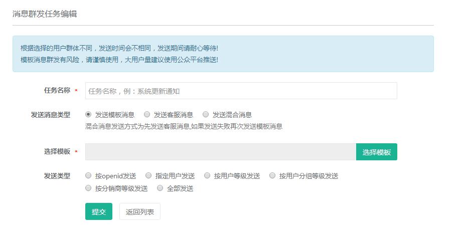 微信消息群发是个功能强大的消息发送应用:支持模板消息或客服消息群发