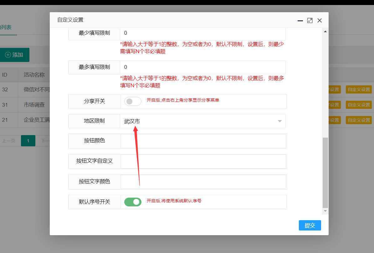 选择左侧菜单的【活动管理】,选择创建好的活动,点击编辑,进入活动编辑页面,选择【高级设置】-【地区验证】,选择设置好的地区分组,如图